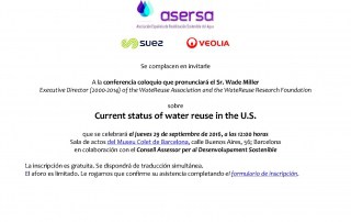 Asersa, Suez and Veolia se complacen en invitarle A la conferencia coloquio que pronunciará el Sr. Wade Miller Executive Director (2000-2014) of the WateReuse Association and the WateReuse Research Foundation sobre Current status of water reuse in the U.S. que se celebrará el jueves 29 de septiembre de 2016, a [...]
