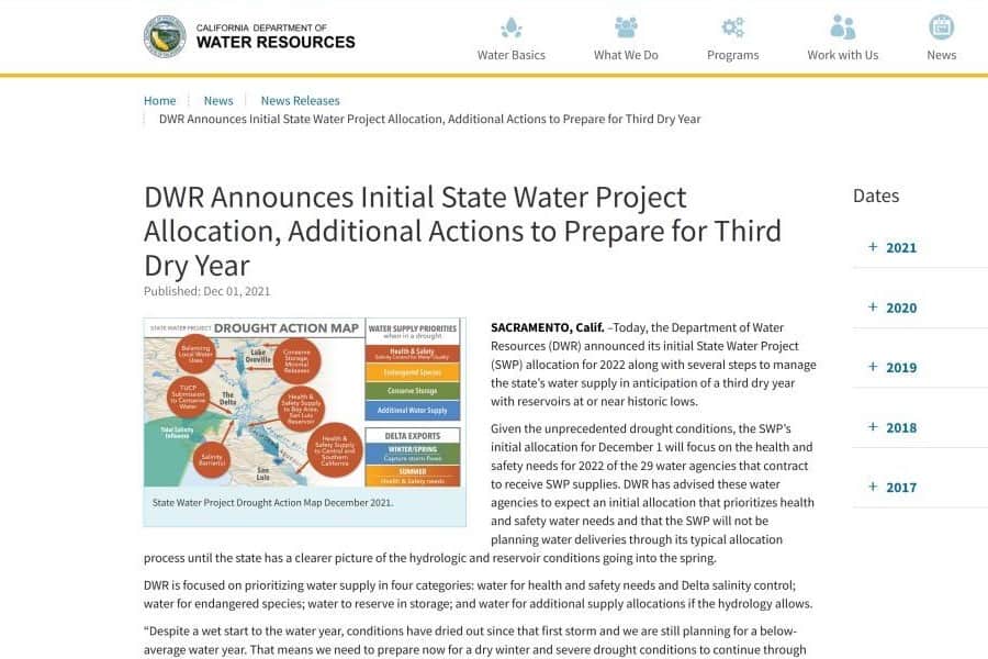 El Departamento de Recursos Hídricos de California (DWR) anunció el pasado miércoles 1 de diciembre las asignaciones iniciales de agua desde el State Water Project durante los primeros meses [...]