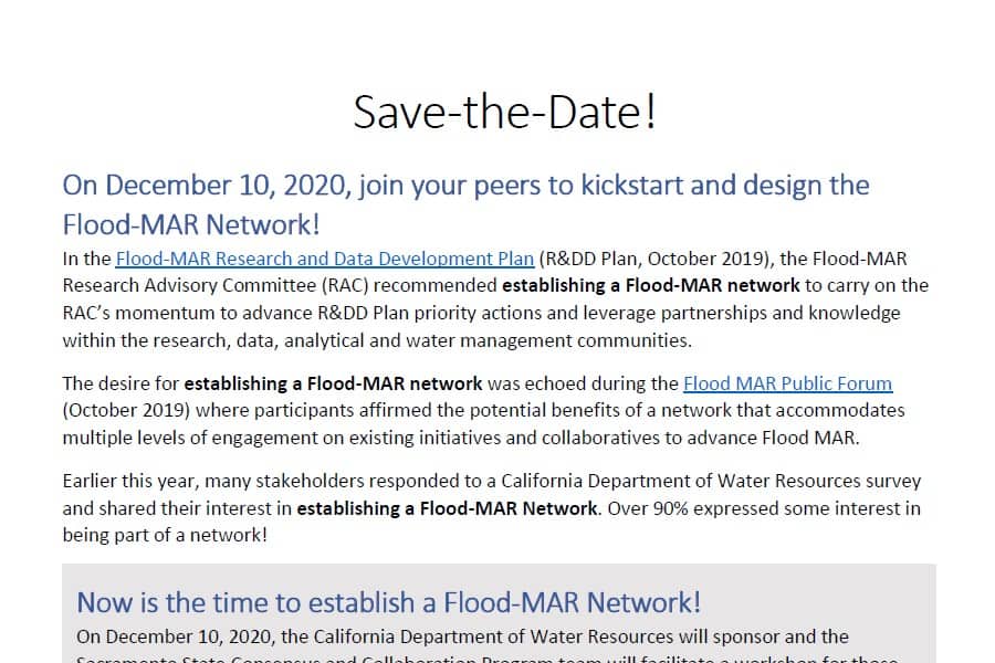 El primer gran paso de la iniciativa de establecer una red de colaboración sobre la Recarga Planificada de Acuíferos con Aguas de Inundaciones (Flood-MAR) en California tendrá lugar el [...]