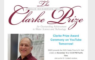 El National Water Research Institute (NWRI) celebró, el pasado 10 de noviembre, el acto de entrega del Clarke Prize 2020 al Dr. Karl Linden, profesor de Desarrollo Sostenible en la Universidad de Colorado en Boulder y destacado innovador en las tecnologías de depuración de aguas residuales, que pronunción una conferencia magistral sobre el "Tratamiento del agua a la velocidad de la luz (ultravioleta)”. Las felicitaciones realizadas tanto por el Comité de selección del Clarke Prize, presidido por el Prof. [...]